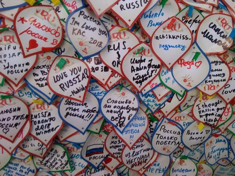 Những băng rôn được giăng khắp nơi với những câu nói như “Cám ơn các bạn đã chiến đấu, các bạn là niềm tự hào của chúng tôi”, “Tuyển Nga này là đội tuyển tốt nhất”; “Những người hùng của chúng ta. Yêu các bạn”, “Dzyuba là linh hồn của tuyển Nga, còn Akinfeev là Chúa”, “Chưa bao giờ chúng tôi tự hào về các bạn như hôm nay”…