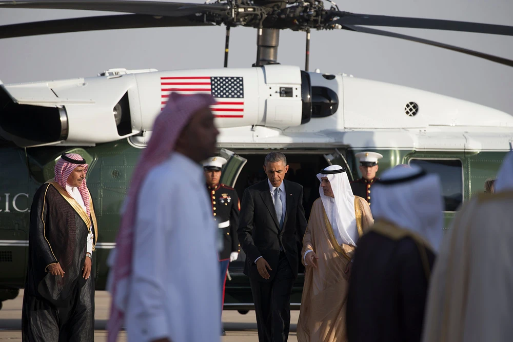 Chính phủ Mỹ lo ngại luật Jasta sẽ hủy hoại quan hệ Mỹ-Saudi Arabia. Tổng thống Mỹ Barack Obama (giữa) được Ngoại trưởng Saudi Arabia Adel al-Jubeir (phải) đón tại sân bay khi ông công du Saudi Arabia tháng trước. (Ảnh: NEW YORK TIMES)