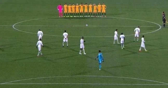 Cầu thủ Úc đang mặc niệm, còn cầu thủ Saudi Arabia coi như không có gì.