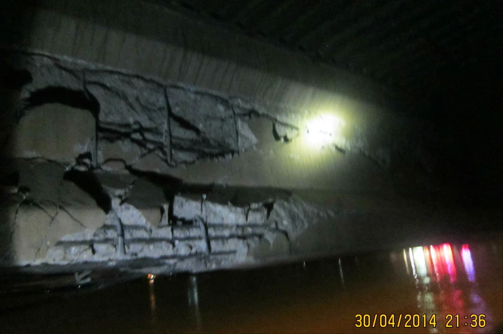 Cú đâm mạnh khiến nhiều mảng bê tông của dầm cầu bị vỡ, lộ rõ sắt bên trong, dầm cầu bị nứt nhiều chỗ.