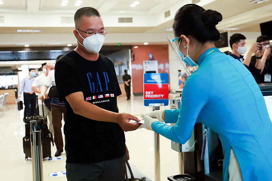 Chiều 12-10, chuyến bay nội địa thương mại chở khách từ TP.HCM về Hà Nội do Vietnam Airlines thực hiện đã hạ cánh xuống sân bay Nội Bài. Đây là chuyến bay đầu tiên sau khi Hà Nội bỏ yêu cầu cách ly tập trung.