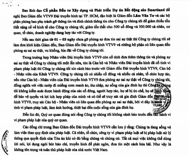 Sau đó Trung tâm Truyền hình Việt Nam tại TP.HCM nhận được Văn bản số 001/2018/SML của Công ty CP Đầu tư xây dựng và phát triển dự án bất động sản Smartland do Chủ tịch HĐQT Vũ Đức Tĩnh ký ngày 13-8. Nội dung công văn yêu cầu gỡ phóng sự, đính chính thông tin và đưa ra cảnh báo việc gia đình giám đốc VTV9, cán bộ, nhân viên có liên quan đến phóng sự có thể bị truy sát vì đưa tin sai sự thật.
