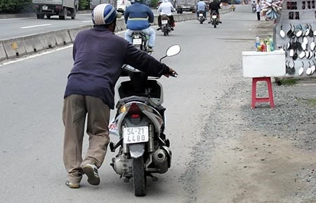 Ông Lịch đang dẫn chiếc xe bị dính đinh đi tìm chỗ vá. Ảnh: PHƯỚC TĨNH