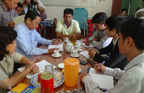 Buổi làm việc của Hội Bảo vệ người tiêu dùng với đại diện Tân Hiệp Phát và người khiếu nại tại Tiền Giang sáng 11-3. Ảnh: H.NAM