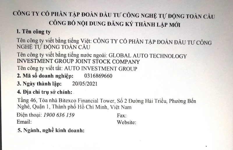 Một doanh nghiệp mới thành lập có tên Công ty Cổ phần Tập đoàn Đầu tư Công nghệ Tự động Toàn Cầu (Auto Investment Group) đăng ký vốn điều lệ lên đến hơn 500.000 tỉ đồng và góp vốn bằng tiền mặt, đang thu hút sự quan tâm của dư luận.