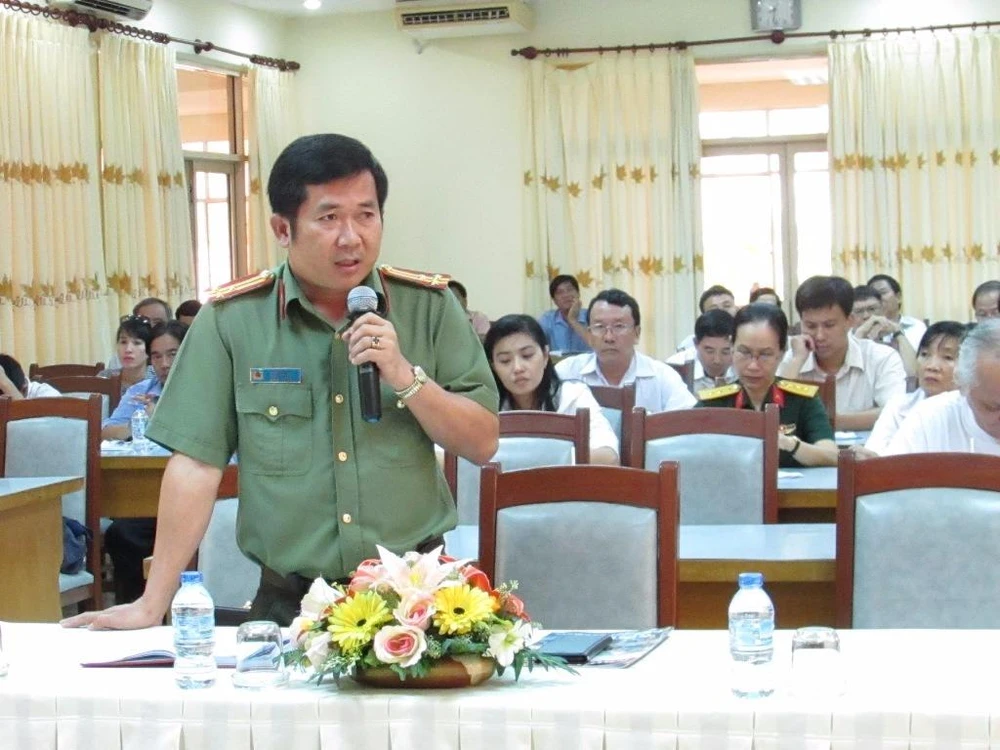 Phó Giám đốc Công an TP Cần Thơ Đinh Văn Nơi thông tin tại hội nghị giao ban báo chí tháng 5. Ảnh: N.NAM