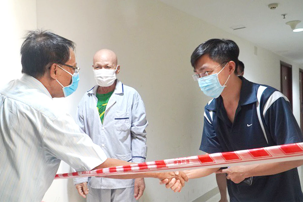 Thành viên ban quản trị chung cư Carillon (quận Tân Bình, TP.HCM) bắt tay chúc mừng bà con ở tầng 15 trước khi sợi dây ngăn cách được tháo xuống. Ảnh: TÂM TRÀ