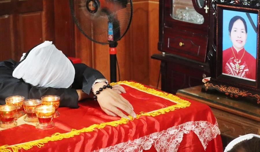 Con trai bà Hoa đau buồn bên quan tài, di ảnh mẹ.