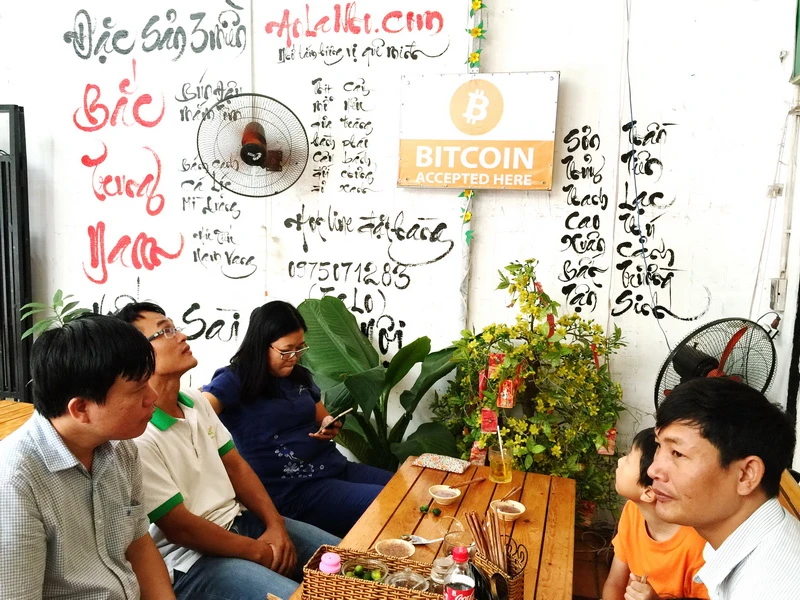 Một số quán ăn tại TP.HCM treo bảng chấp nhận thanh toán bằng bitcoin. Ảnh: QUỲNH NHƯ