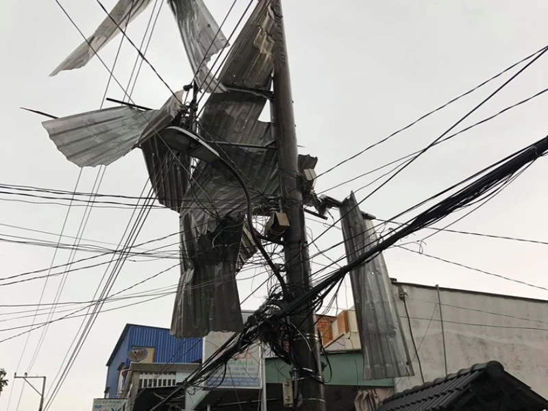 Mái nhà bị gió giật tung bay vướng trên trụ điện.