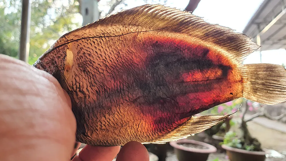 Cá bổi bị sét đánh khi đem làm khô thấy rõ tụ huyết ở phần đuôi.
