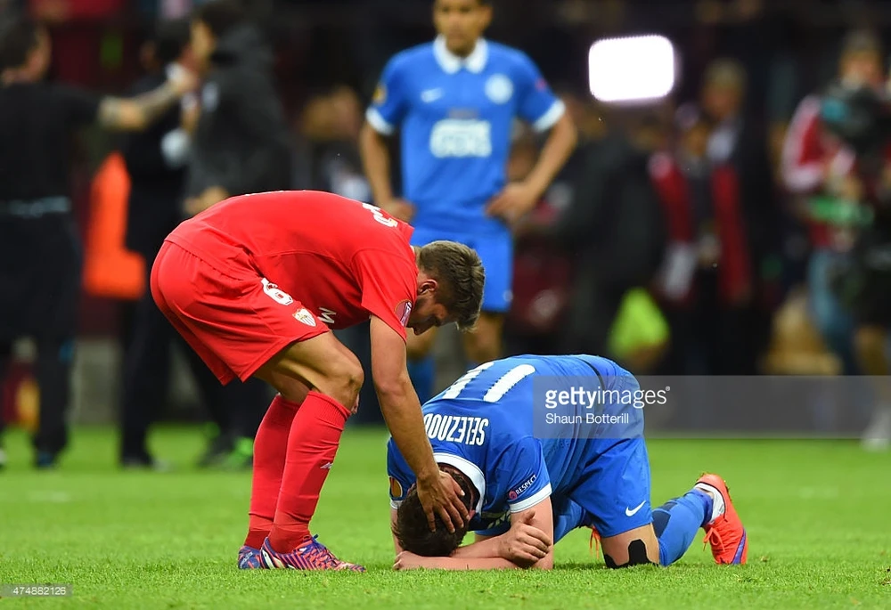 Cầu thủ Sevilla an ủi các cầu thủ Dnipro sau khi trận đấu kết thúc