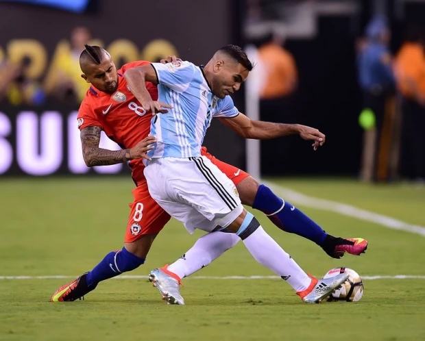 Gabriel Mercado tranh bóng cùng Arturo Vidal trận chung kết Copa America 2016