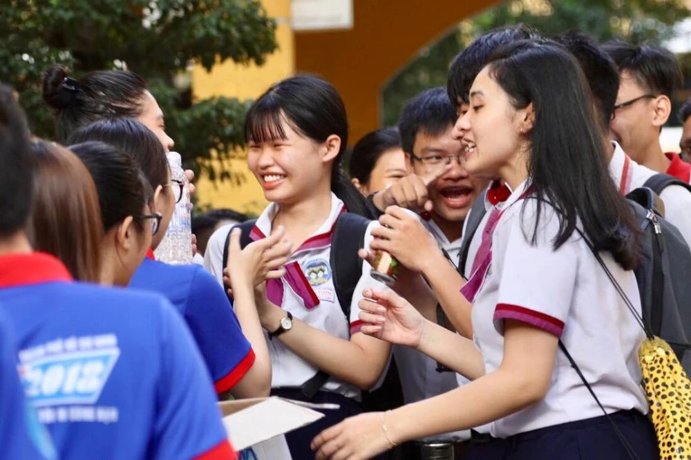 Thí sinh tươi cười trước môn thi đầu tiên tại điểm thi THPT Phú Nhuận. Ảnh: NGUYỄN QUYÊN