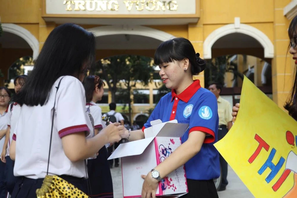 Tại điểm thi THPT Trưng Vương, quận 1, từ sớm đội Tiếp sức mùa thi của Trường ĐH Y Dược TP.HCM đã có mặt để phát nước và kẹo cho các sĩ tử.