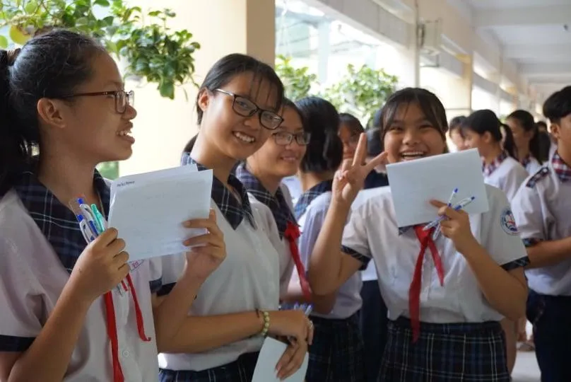 Thí sinh tại điểm thi THCS Nguyễn Trãi (TP.HCM) tươi cười trước giờ thi.