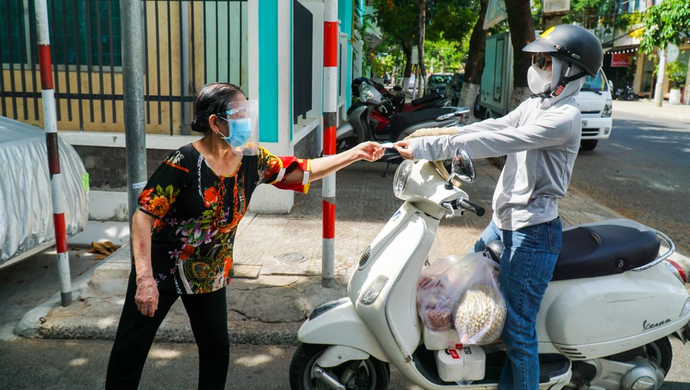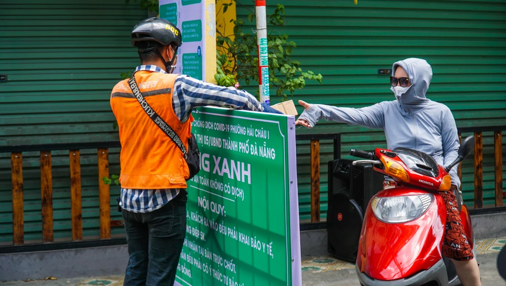 Nhân viên giao hàng chỉ được thực hiện giao dịch ở phía bên ngoài chốt bảo vệ "vùng xanh". Ảnh: B.T.