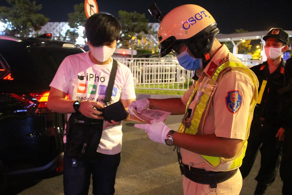 Lái xe khai báo thông tin hành trình với CSGT ở khu vực bên trong chốt kiểm soát y tế.