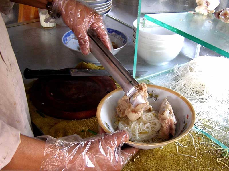 Nhiều người kinh doanh thức ăn đường phố đã tự giác mang bao tay khi chế biến thức ăn cho khách. Ảnh: TRẦN NGỌC