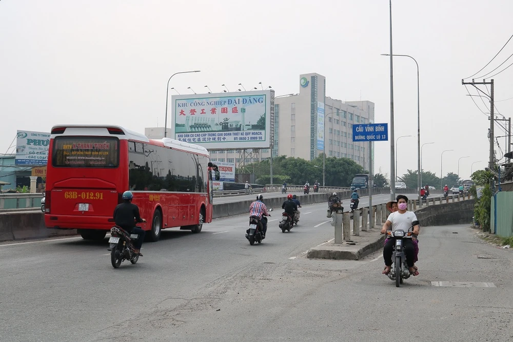 Bên kia chân cầu Vĩnh Bình là địa phận tỉnh Bình Dương, khu vực người dân thường đứng đón xe đò về quê. Ảnh: LA HIÊN