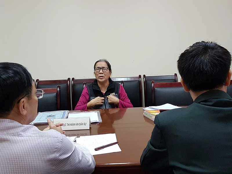 Bà Thỏa đã ít nhất ba lần lên trụ sở tiếp dân này. Mọi giải thích theo pháp luật bà đều không nghe. Vì vậy, chuẩn bị cho cuộc làm việc, đại diện Cục THADS tỉnh Hòa Bình đã được mời lên phối hợp. Chấp hành viên Hòa Bình vốn thuộc lòng vụ việc thuyết phục: “Giờ nếu bên được THA giảm cho bà chỉ phải trả 15 triệu, bà có đồng ý không?”.