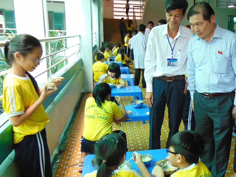Đoàn giám sát của Quốc hội khảo sát bếp ăn và bữa cơm của học sinh Trường Tiểu học Trưng Trắc (quận 11, TP.HCM). Ảnh: TRẦN NGỌC