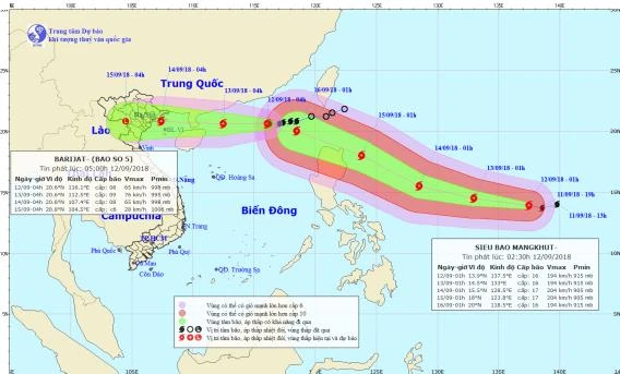 Chiều 12-9, Trung tâm Dự báo Khí tượng Thủy văn Trung ương cho hay diễn biến bão kép trên biển (gồm bão số 5 và siêu bão Mangkhut) đang diễn biến phức tạp. Đặc biệt, siêu bão Mangkhut đang trở nên mạnh hơn một cấp so với 4 giờ sáng cùng ngày.