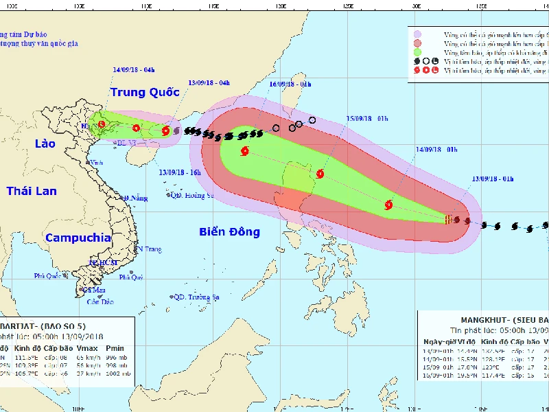 Về siêu bão Mangkhut, lúc 14 giờ ngày 13-9, vị trí tâm siêu bão cách đảo Luzon (Philippines) khoảng 890 km về phía Đông Đông Nam. Sức gió mạnh nhất vùng gần tâm siêu bão mạnh cấp 17 (200-220 km/giờ), giật trên cấp 17.