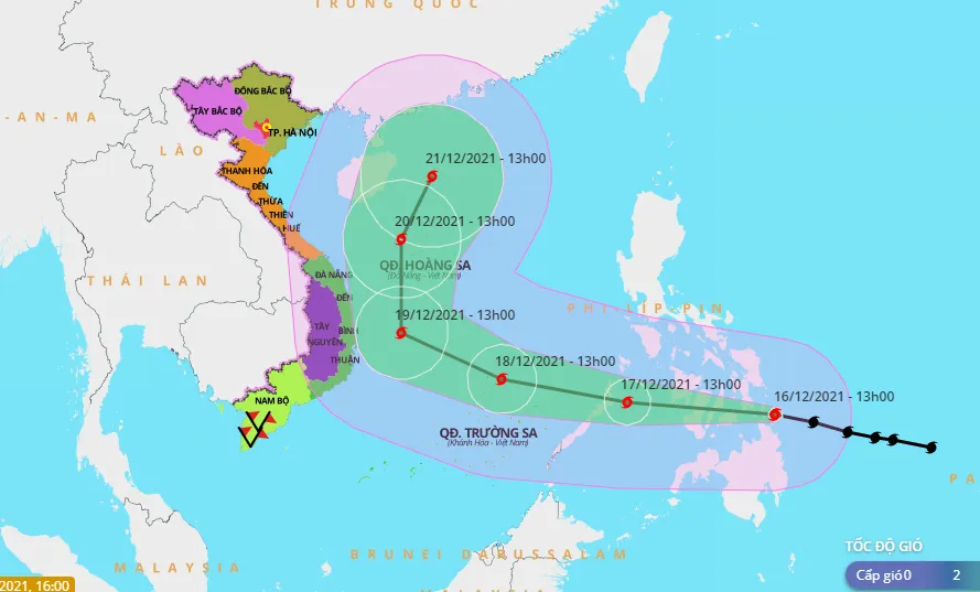 + Ông Trần Quang Năng: Chiều nay, bão RAI tiếp tục mạnh thêm. Chúng tôi xác định đây là cơn siêu bão với cấp gió mạnh nhất vùng gần tâm bão ở cấp 16, giật trên cấp 17. Vị trí hiện tại lúc 16 giờ chiều nay đang ở trên vùng biển miền Trung, miền Nam của Philippines.
