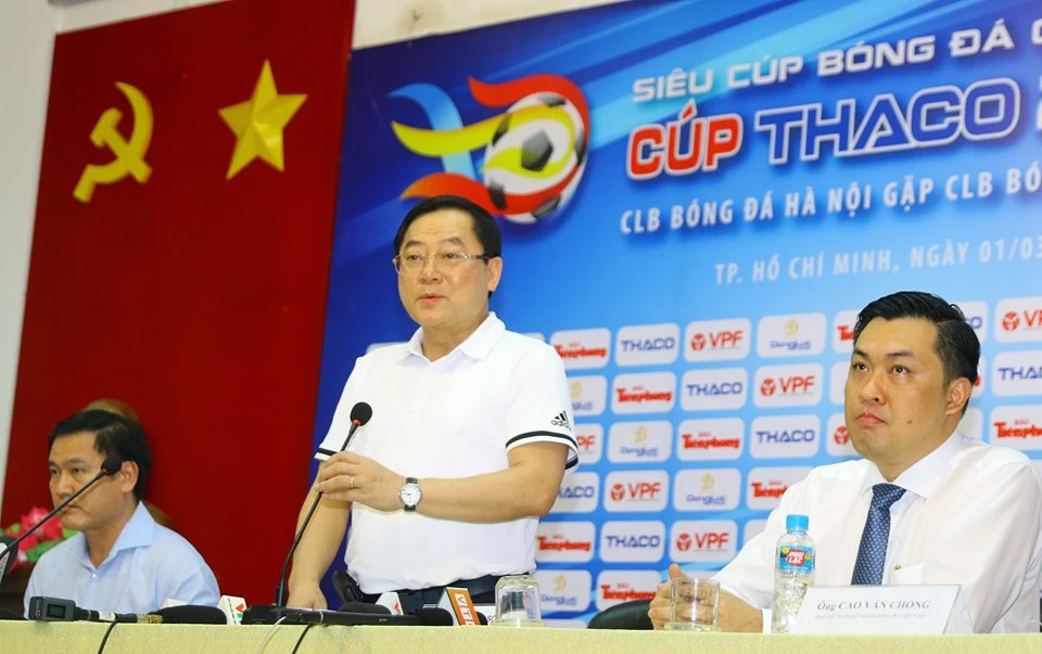 Đồng Trưởng ban tổ chức giải Lê Xuân Sơn (Tổng biên tập báo Tiền Phong, giữa) cùng Phó Chủ tịch VFF Cao Văn Chóng (phải) và Chủ tịch LĐBĐ TP.HCM Trần Anh Tú tại buổi họp báo Siêu cúp 2020. Ảnh: NGỌC TRÂM