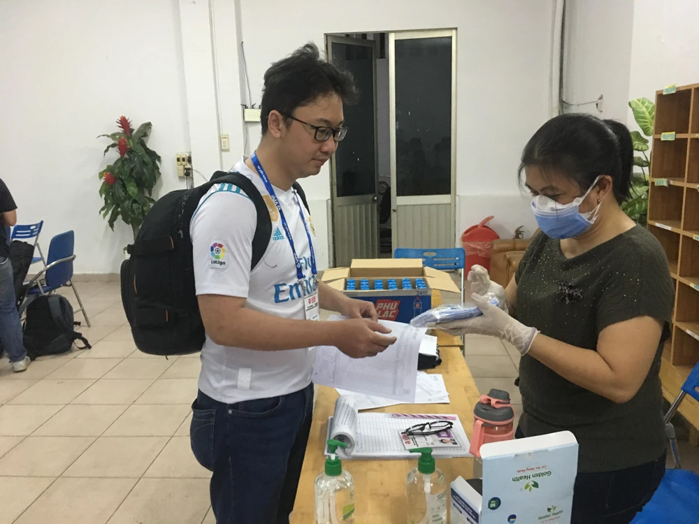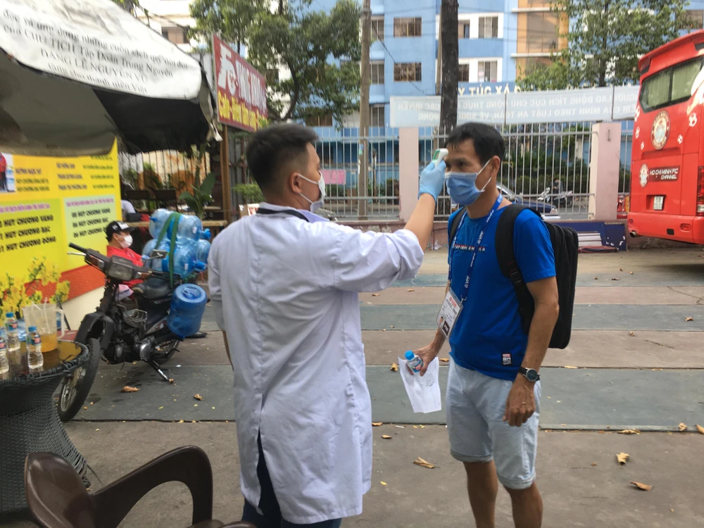 Phóng viên Tấn Phước báo Pháp Luật TP.HCM được đội ngũ y tế kiểm tra thân nhiệt trước khi vào sân tác nghiệp.