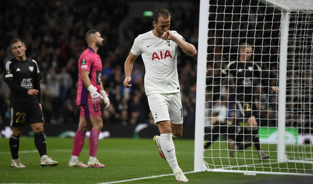 Harry Kane của Tottenham Hotspur ăn mừng điên cuồng sau khi ghi bàn thắng thứ 5 cho đội bóng và bàn thắng thứ ba của riêng mình trên sân nhà trong trận tiếp Mura ở giải hạng ba châu Âu.