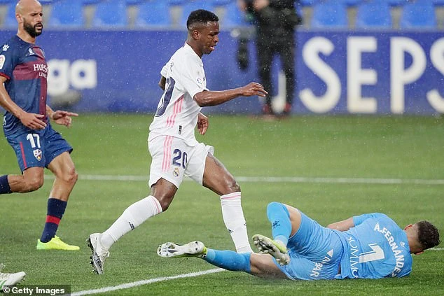 Vinicius hai lần đối mặt thủ môn Alvaro trong hiệp một nhưng không thể ghi bàn. Ảnh: Getty Images.