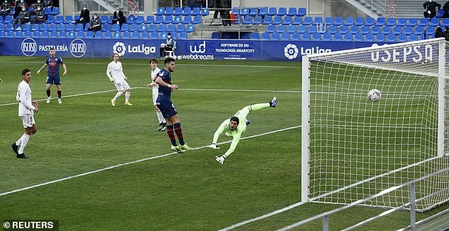 Sang hiệp hai, Real nhận bất ngờ liên tiếp từ chủ nhà Huesca, khi ở phút 46 tiền vệ Mikel Rico dứt điểm một chạm sau pha tạt bóng của đồng đội đưa bóng chạm vào xà ngang khung thành.