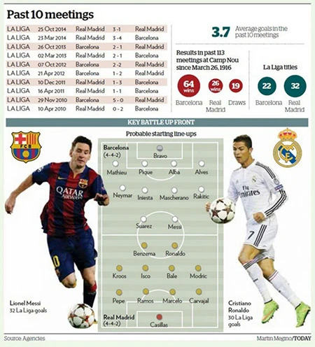 …Trên sân của mình, Barcelona chỉ cần hòa là duy trì ngôi đầu bảng, còn Real muốn đòi lại ngôi nhất bảng thì phải thắng, một nhiệm vụ chẳng phải dễ dàng cho Ronaldo và những người bạn.