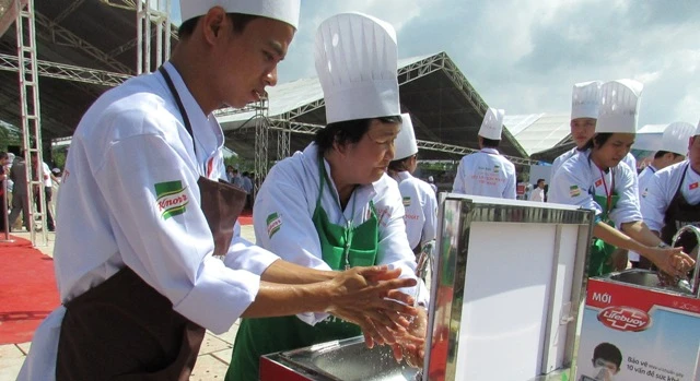 Đầu bếp và phụ bếp cùng rửa tay trước khi vào chế biến đồ ăn