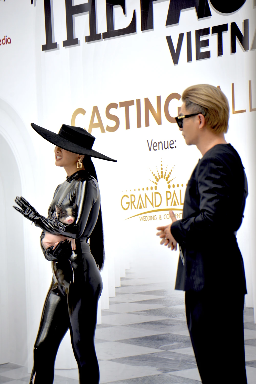 Siêu mẫu Anh Thư chơi lớn dắt heo dễ thương lên thảm đỏ The Face Việt Nam. Ảnh: NGUYỄN TRÀ