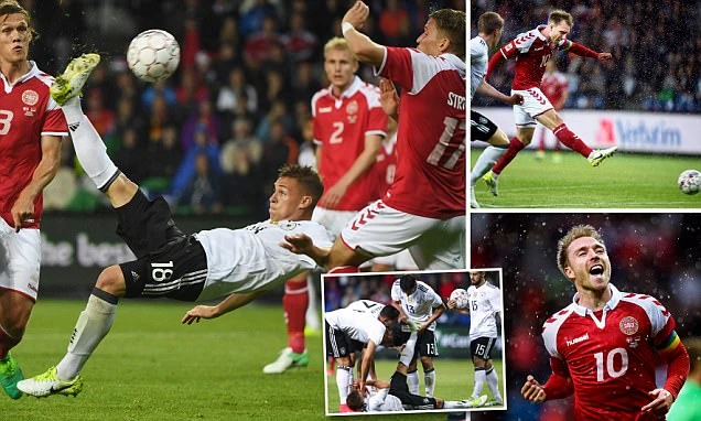 Phút 18, từ pha phối hợp không ăn ý bên phần sân nhà, các cầu thủ Đức để mất bóng rất nguy hiểm ngay sát khu vực 16m50, cầu thủ thuộc biên chế Tottenham, Christian Eriksen nhanh chân lao tới tung cú sút sấm sét bóng đi hiểm hóc, thủ thành Trapp dù chạm được bóng nhưng không thể cứu thua. 1-0 cho Đan Mạch.