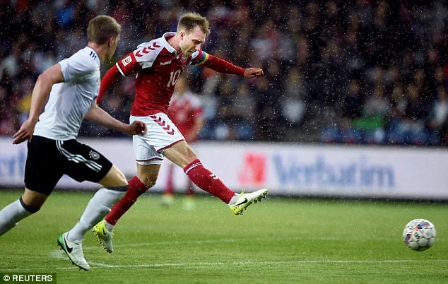 Christian Eriksen mở tỉ số cho Đan Mạch.