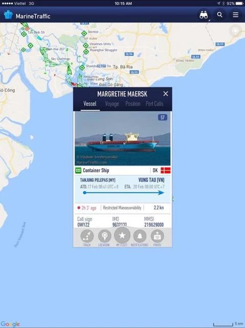 Lộ trình của siêu tàu Margrethe Maersk từ cảng Tanjung Pelepas, Malaysia đi cảng Cái Mép, Việt Nam.