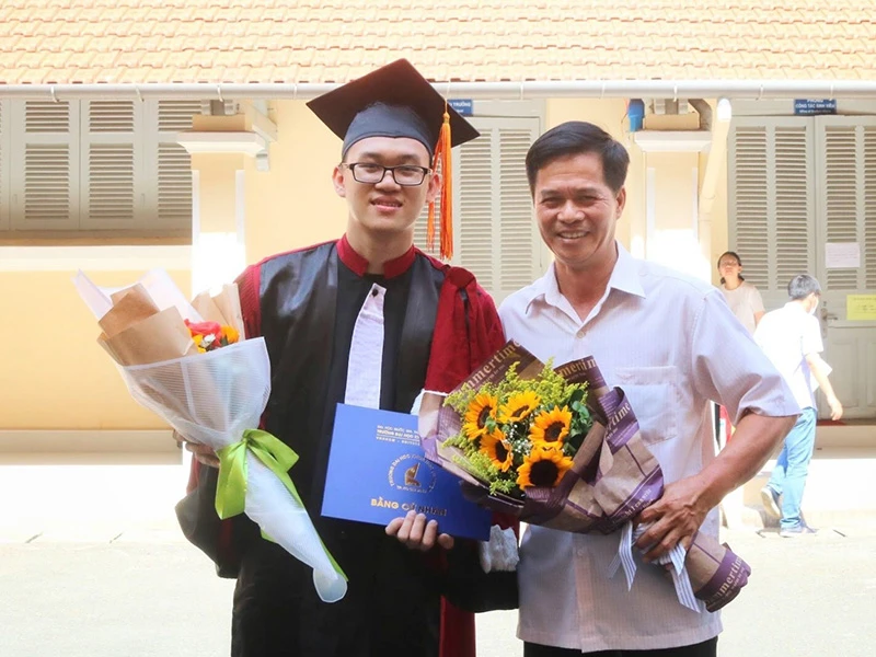 Nguyễn Minh Huy chụp ảnh cùng cha của mình tại lễ tốt nghiệp.