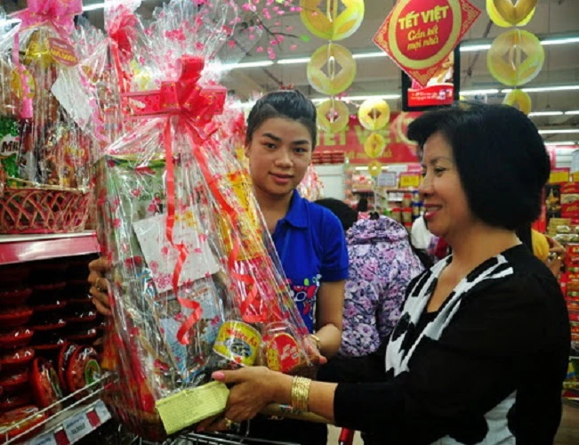 Giỏ quà tết đa dạng mẫu mã và lên kệ sớm hơn mọi năm, đó là nhận định cho thị trường giỏ quà tết năm nay. Tại hệ thống siêu thị Co.opmart, từ ngày 15-12 đã bắt đầu trưng bày các giỏ quà tết. Đặc biệt các mẫu giỏ quà đa dạng mẫu mã, nhiều mức giá, giúp khách hàng dễ dàng lựa chọn sản phẩm phù hợp với mọi nhu cầu biếu tặng. Để có thể tung giỏ quà tết ra thị trường sớm, hệ thống chủ động phối hợp cùng hàng trăm nhãn hàng uy tín để thiết kế sẵn 48 mẫu giỏ quà có giá dao động từ gần 70.000 đồng đến gần 2,1 triệu đồng/mẫu. Mức giá này đảm bảo phục vụ khách hàng ở mọi phân khúc từ bình dân đến cao cấp. Nếu như các mẫu giỏ quà giá từ 149.000 đồng đến 1 triệu đồng đặc biệt phù hợp để doanh nghiệp làm quà biếu nội bộ thì mẫu khoảng 2 triệu đồng lại khá phù hợp để biếu tặng đối tác.