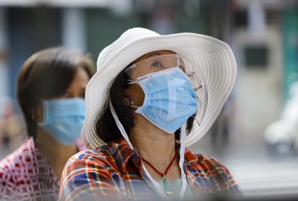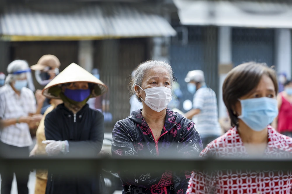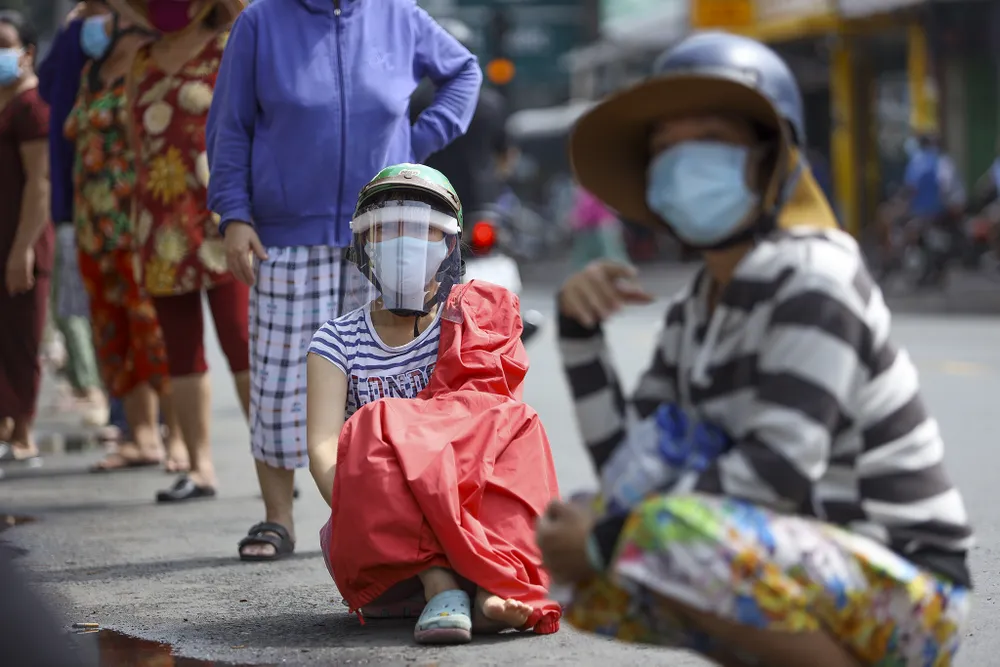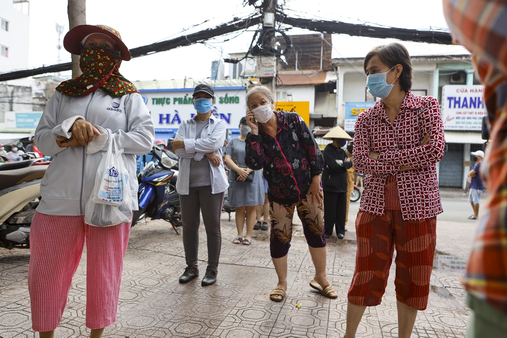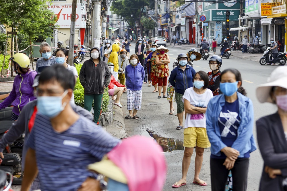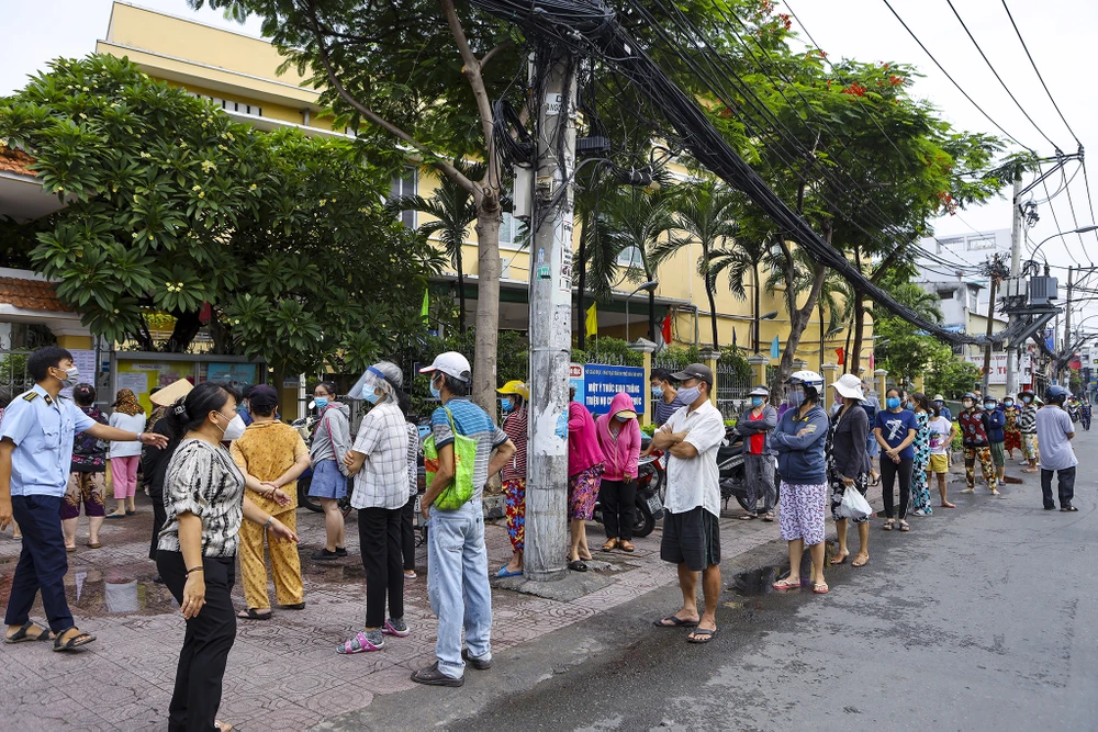 Sáng ngày 14-7, nhiều người dân sắp hàng để được đi "siêu thị di động" tại trường tiểu học Nguyễn Đình Chiểu, đường Lê Quang Định, quận Bình Thạnh TP.HCM.
