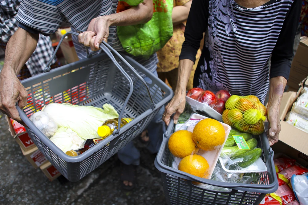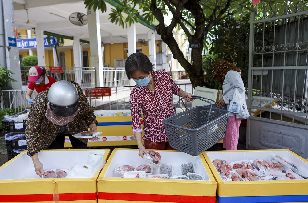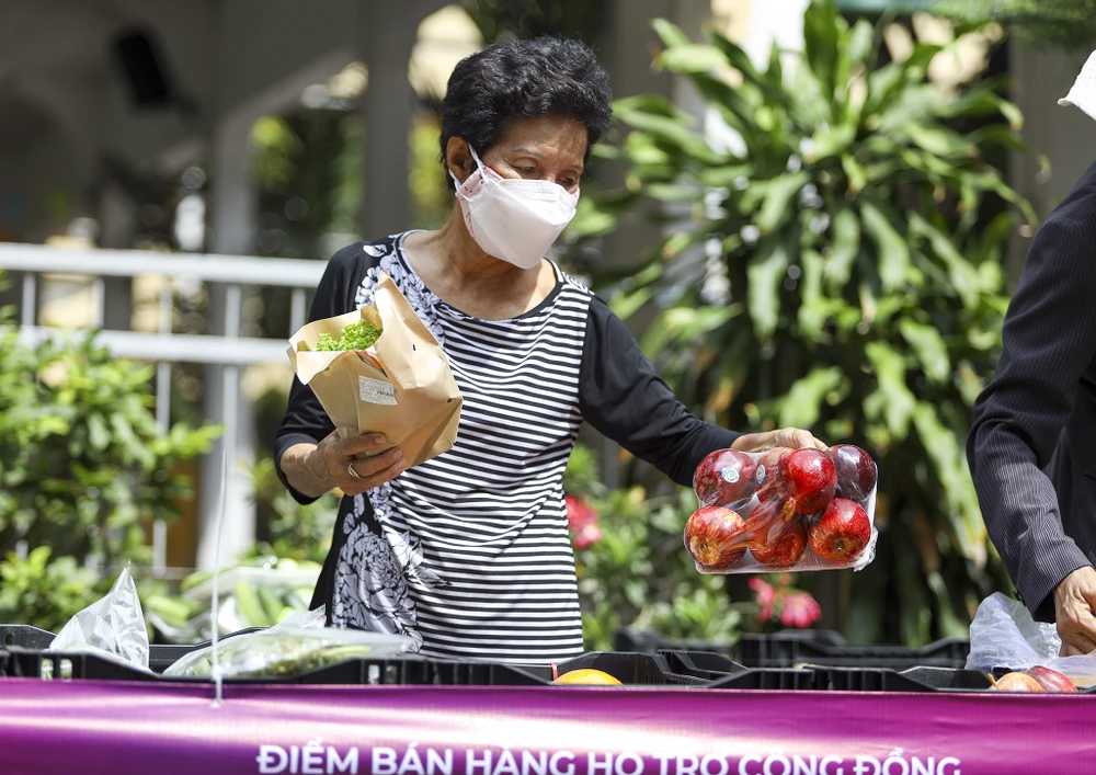 Bà Lài chọn được một bó rau xà lách và một vĩ táo. "Điểm bán đóng gói sẵn nên mua rất thuận tiện, đi chợ như thế này vừa nhanh mà lại an toàn, tôi cảm thấy an tâm lắm" bà Lài nói.