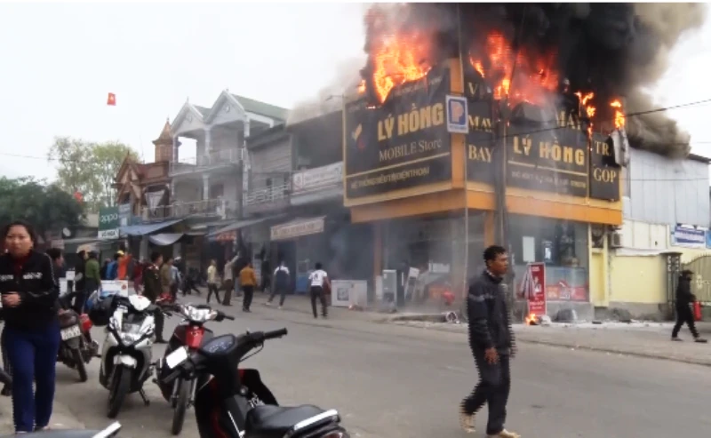 Khoảng 7 giờ 30 sáng 23-3, người dân hốt hoảng khi phát hiện khói, lửa bốc lên từ Siêu thị điện máy Lý Hồng gần trung tâm chợ thị trấn Hòa Bình.