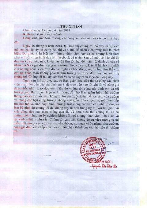 Trong một diễn biến khác, trả lời báo giới, bà Nguyễn Thị Thu Ba, chủ Siêu thị Vĩ Yên, cho biết phía siêu thị đã cử người đến xin lỗi em S. và gia đình.