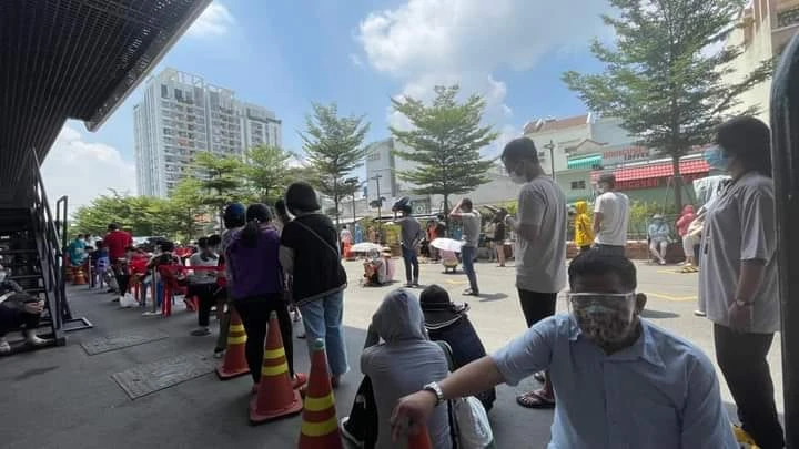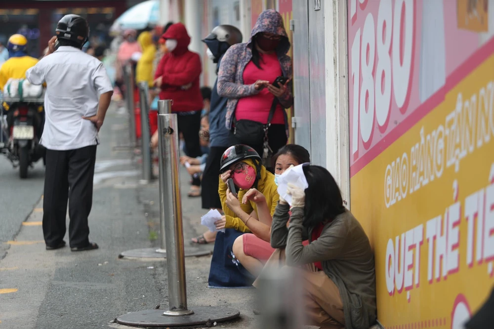 Từng đoàn người xếp hàng nối dài từ nhà xe tới cổng siêu thị BigC Tô Hiến Thành (quận 10). Vì số lượng quá đông nên người dân cũng không đảm bảo khoảng cách an toàn khi ngồi chờ. Ảnh: Thu Hà