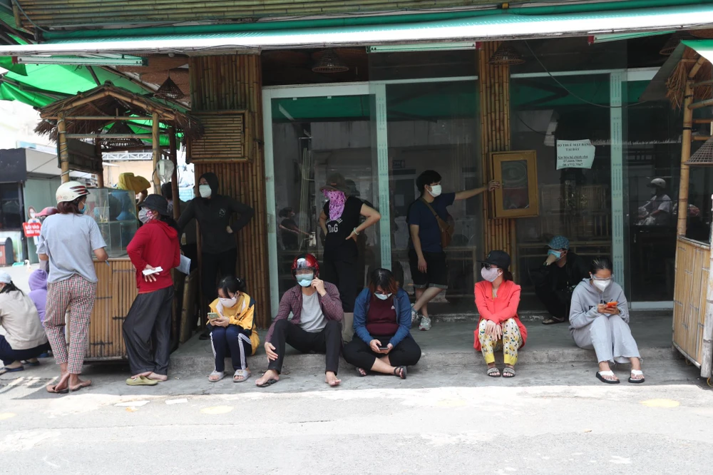 Không chỉ phía trong sân siêu thị, người dân còn ngồi tại các hàng quán bên đường, để tới lượt mua sắm. Ảnh: Thu Hà