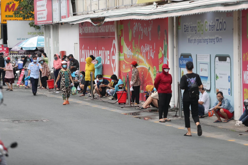 Cụ thể, sáng và trưa 21-8 tại các khu vực siêu thị BigC Tô Hiến Thành (quận 10), Emart (Gò Vấp), MM Mega Market (quận 12)... hàng trăm người xếp thành hàng dài chờ mua thực phẩm, gây kẹt cứng đoạn đường vào các siêu thị.