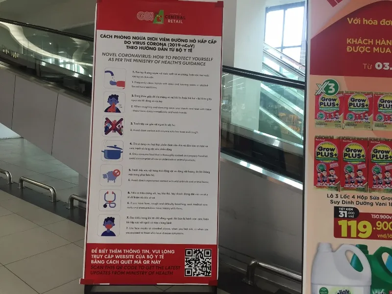Tại siêu thị có bảng hướng dẫn khuyến cáo người dân phòng, chống dịch Corona.